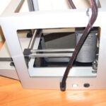Корпус принтера сделан из листового плотного пластика, обклеенного с двух сторон тонким алюминием. Размеры принтера без учета держателя катушки пластика (филамента) — куб со стороной 20 см. Действительно он очень компактный.